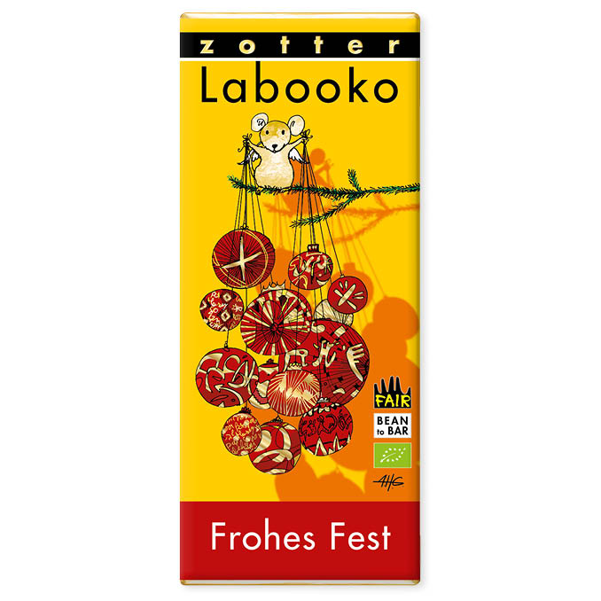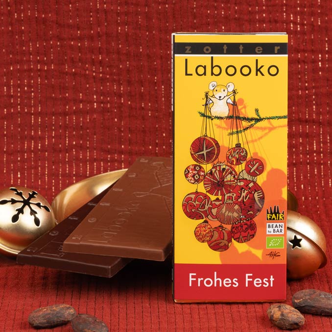 Eine Milchschokolade und eine dunkle Tafel zum Fest. 2 unterschiedliche Tafeln in einer Verpackung: Einmal eine dunkle Ursprungsschokolade mit dem allerersten fair gehandelten Bio-Kakao aus Togo. Und einmal eine Milchschokolade mit mildem Zorzal-Kakao, der ein echter Umweltschützer ist und ein Vogelschutzgebiet fördert. Motiv mit Goldeffekt.