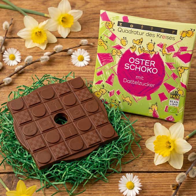 Die Oster-Milchschoko mit der reinen Süßkraft aus Datteln. Eine Milchschokolade mit 50 % Kakaoanteil, Bio-Bergmilch und trendigem Dattelzucker, dem neuen Shootingstar unter den alternativen Zuckervarianten. Ein naturbelassener Zucker, der aus gemahlenen Datteln besteht. Mit leichter Karamellnote und einer Süßkraft vergleichbar mit braunem Zucker.