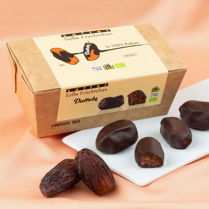 Superweiche, ungeschwefelte Bio-Datteln überzogen mit reiner Kuvertüre mit 100 % Kakaoanteil, ohne Zuckerzugabe.