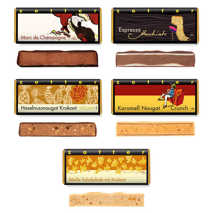 Das Probierpaket mit 10 klassischen und zugleich innovativen handgeschöpften Schokoladen (à 70g), unter anderem mit Bestsellern wie der beliebten Sorte »ButterKaramell« mit knackigen Karamell-Crispies oder »NougatVariation« mit abwechselnd geschichtetem Mandel- und Haselnussnougat, getaucht in eine dunkle Milchschokolade.
